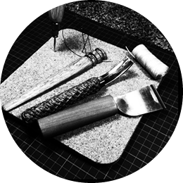 ローハイドの製品はデザインから裁断、仕上げまでの全工程を一人の革職人が一貫して造り上げています。製品はすべてサドルステッチという縫い方で一針一針縫っており、万が一、糸が切れても縫い目がすぐにほどけない丈夫なつくりで末長くご愛用して頂けます。カービングスタイルは、アメリカはテキサス州で現役サドル職人のDavid Kawamura氏を師とし、David氏の独自スタイルである唐草をベーススタイルに力強く勢いのあるカービングをコンセプトにしております。
